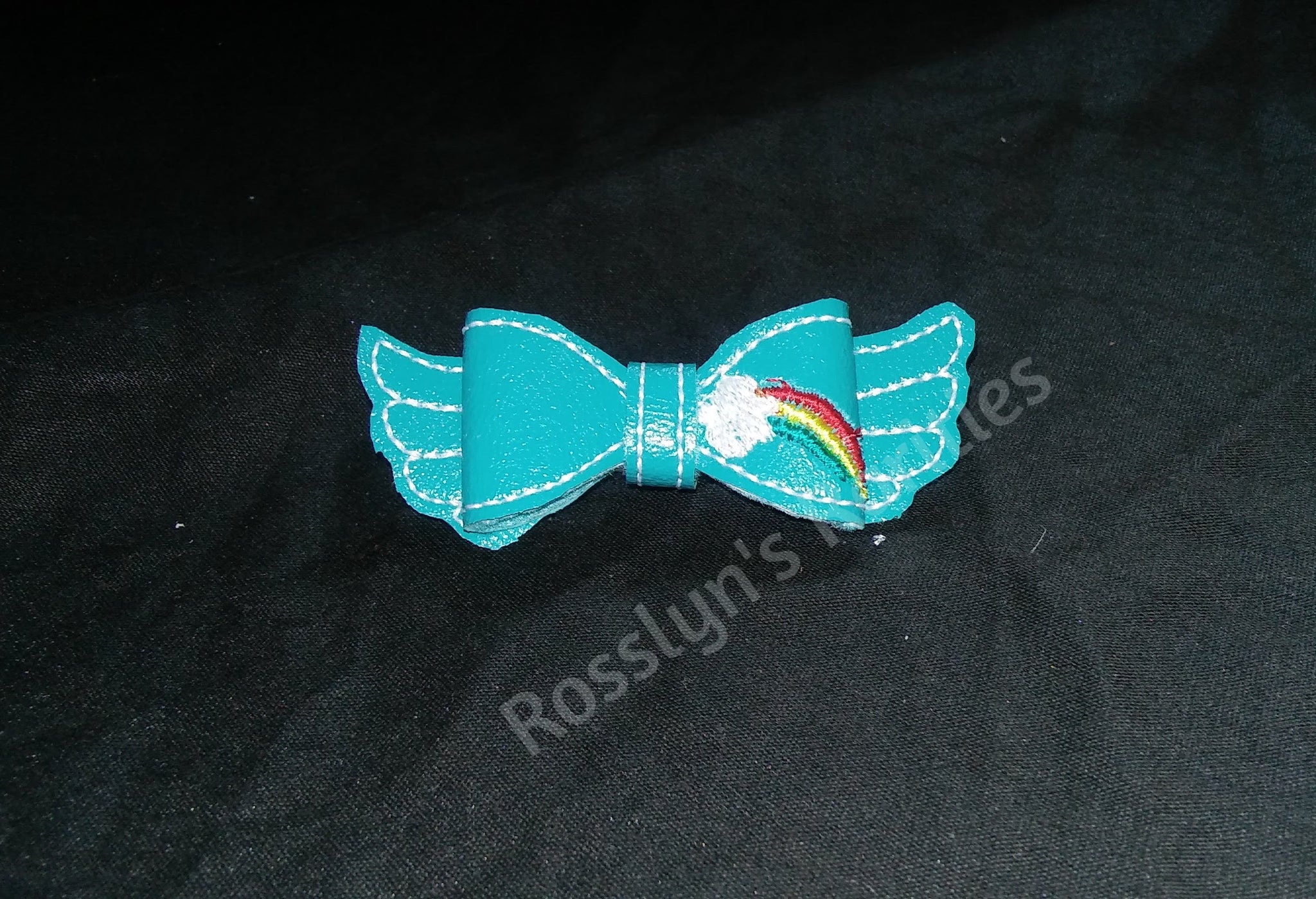 Rainbow Hair Bow made with Machine Embroidery on Faux Leather with French Barrette.